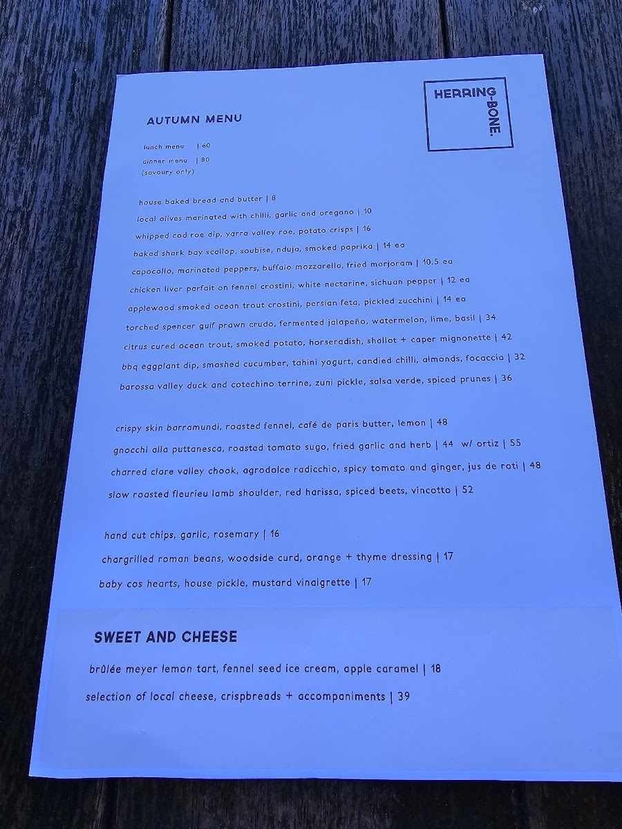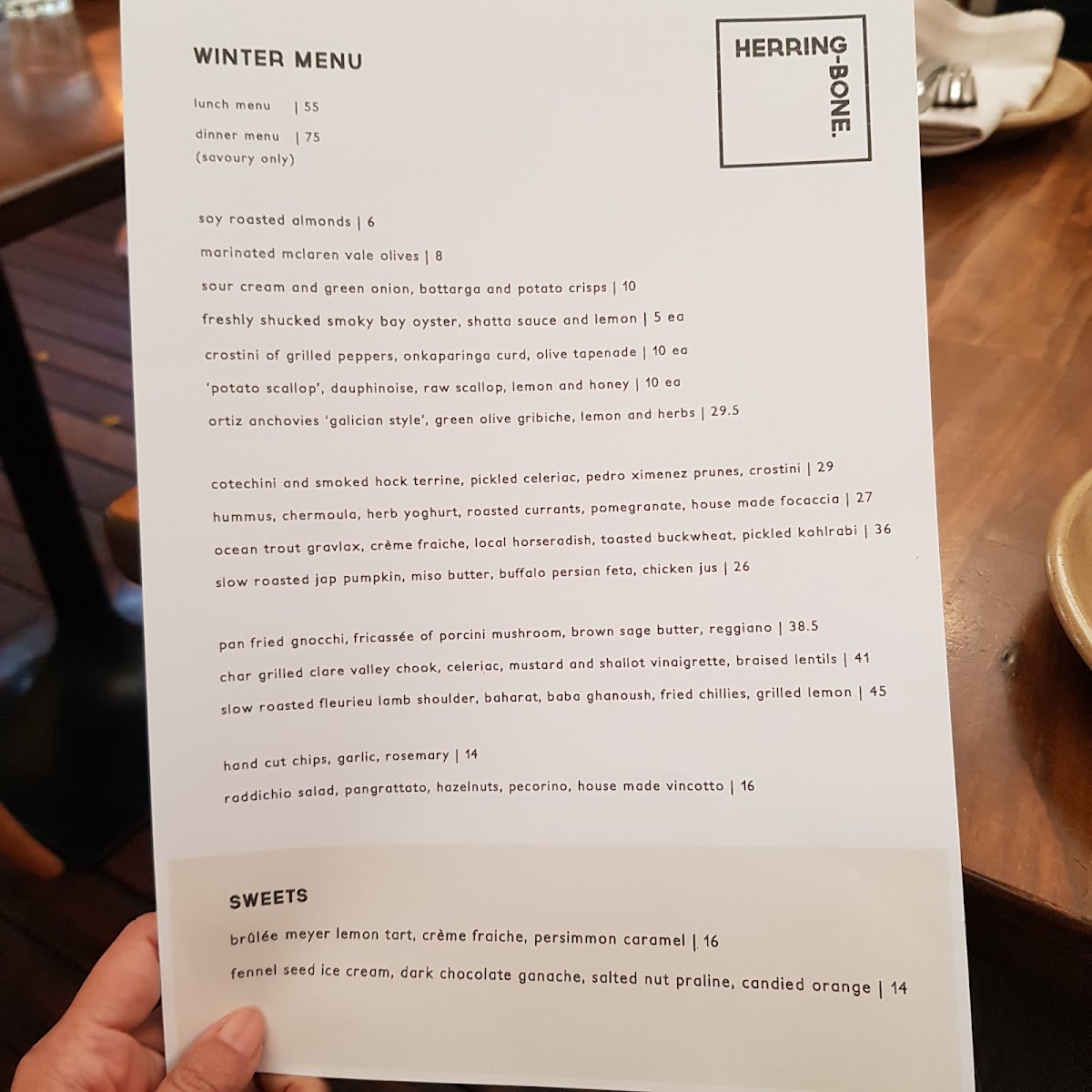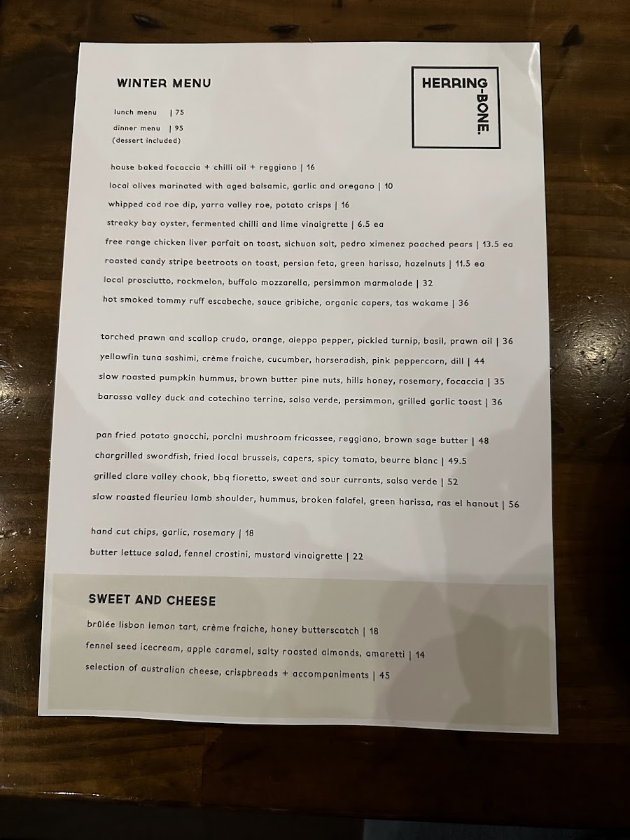 Herringbone’s menu offers a thoughtfully curated selection that blends fresh, seasonal ingredients with approachable, share-friendly dishes. The style leans towards refined yet relaxed dining, where plates balance familiar comforts like slow roasted lamb shoulder and pan-fried potato gnocchi with lighter, vibrant options such as citrus cured ocean trout and radicchio salad.